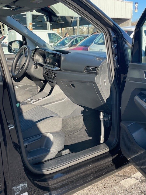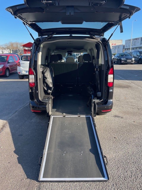 Aménagé pour l’accès d’une personne en fauteuil roulant à l’arrière : – Décaissement d’une longueur de 1,43m avec revêtement antidérapant et insonorisant et d’une largeur de 0,77m – 4 enrouleurs Q’Straint dont 2 électriques à l’avant avec ceinture 3 points – Roue de secours fixée à l’arrière, à gauche. – Rampe manuelle – Éclairage sur Hayon de coffre pour faciliter l’accès en fauteuil roulant